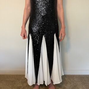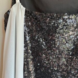 mini sequin layered with chiffon accent scarf and skirt. Black and white. Fantastic special occasion dress. Elegant. FINAL SALE. NO RETURNS Wore one time.