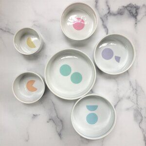 This design-forward set of low white nesting bowls are each illustrated on the exterior and interior of a circular fraction to visually depict and communicate the size of the bowl.