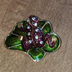 Met Museum Pendant Brooch Pin Purple Frog Rhinestone Gold Accents Green Leaf