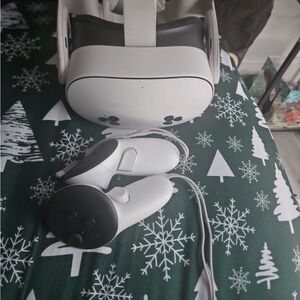 White wireless VR headset with matching controllers. Comfortable padded head strap and intuitive controller buttons for immersive gameplay. Lightweight design for extended use. Includes wrist straps on controllers for secure handling. Ideal for VR games, apps, and media in white finish.