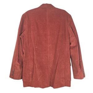 Mens corduroy jacket in a rust/brick red color with military-inspired styling and decorative patches.