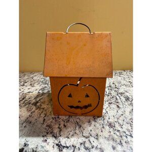 Stunning rust orange metal lantern featuring a carved jack-o’-lantern face and “BOO!” cutout—designed to house a candle or tealight (insert included). Constructed from durable metal, it stands out with its rustic patina and handle for easy display. Perfect as a centerpiece or on mantles, this vintage-style piece adds festive flair to any Halloween or fall-themed setup.