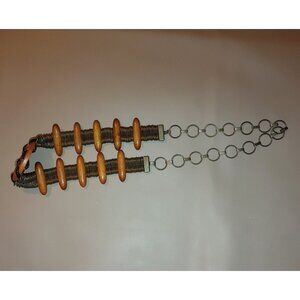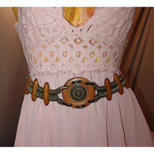 This vintage boho belt features a distinctive blend of wood and brass metal with a decorative centerpiece. Its unique design adds a touch of artistic flair to any outfit. Ideal for those seeking a statement accessory that combines elegance with a touch of rustic charm.