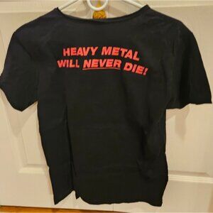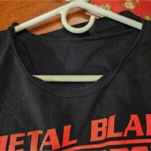 Metal Blade Records T-shirt, size Medium (size tag removed from alteration). Neck cut and stitched to make shirt round neck instead of crew neck. Pit to pit: 20", collar to hem: 24". Excellent new condition.