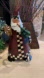 Vintage bobble Santa from Garden Ridge. Stands 17” tall with an 8 5/8” base. Santa is wearing a burgundy suit, holding a Christmas tree, present and candy cane.