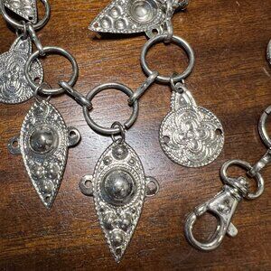 Dangling charms. Two clasps so that you can change the length and double wrap. Flat, beaten metal. No flaws. This makes tinkling noises when you walk. Such a fun piece! Versatile and adjustable. 53” total length. It is wrapped twice around the mannequin.