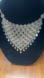 Features little florets linked together framed by little diamond shapes. The necklace has a brass or gold-like finish. The triangle is approximately 5” wide by 6” long and the necklace is about 20” long with 3 clasp points.