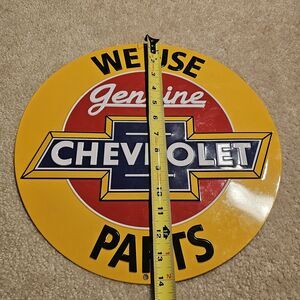 Metal Chevrolet Parts Advertising Sign 14" Embossed Round "We Use Genuine Parts"