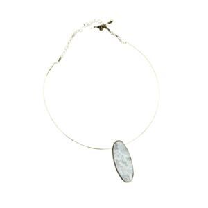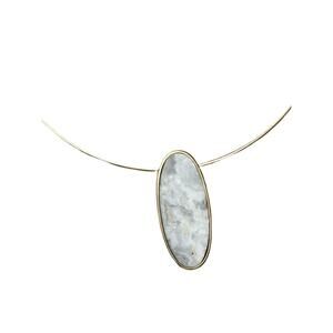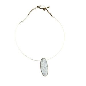 Golden collar style necklace with a grey marbled stone pendant. This necklace is adjustable and simple, chic and classic. Great for layering, easy to wear in the summer. Perfect for gemstone lovers that like a sophisticated look. Adjustable up to about 16" with the pendant being 1 1/2" long by 3/4" wide.
