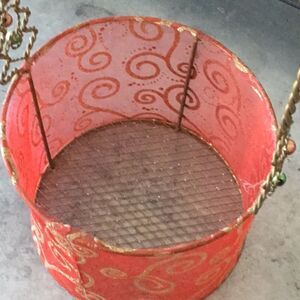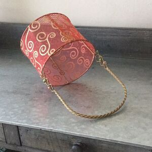 11 1/2” tall (inc. handles) gold basket, 6” diameter. Metal Christmas trees on the handles. Red sheer fabric with gold scroll design. Metal mesh base. Great preowned condition.