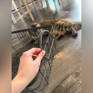 metal dishrack. Better Homes & Gardens brand. used for 2 years but we don't need it anymore because we got a new dishwasher. still in great condition. easily washed/sanitized as it is metal. has 2 handles on either side. 4 little wire feet on the bottom. includes a utensil holder that can be placed on any of the sides. the utensil holder is just metal, but does not include the interior covering. measurements are below