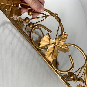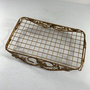Metal Gold Colored Casserole Holder Carrier Basket Leaf Berry Pattern Sturdy Rectangular. Base measures 15.5" X 9". Overall measures 18" X 11" X 3.5". Minor signs of use.