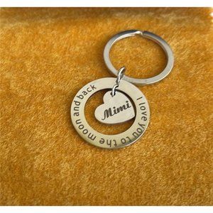 -- This beautiful Metal Silver Round Mimi Keychain is a perfect way to show your love and appreciation for the amazing Mimi in your life! The keychain is engraved with the heartfelt message I love you to the moon and back and features a charming heart charm along with the round silver keychain.
