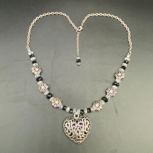 Metal Filigree Style Heart Necklace with Metal Flower Motif & Crystal Beads