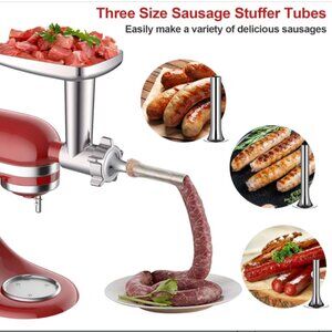 All-in-One Meat Grinder for KitchenAid Mixer: It includes the main grinder unit, 2 grinding blades, 4 grinding plates, 3 sausage stuffing tubes, 1 cleaning brush, 1 removable food tray, and 1 food pusher. In just minutes, it transforms your stand mixer into a versatile kitchen tool