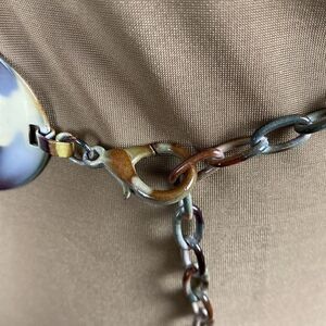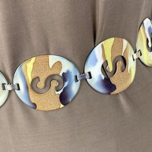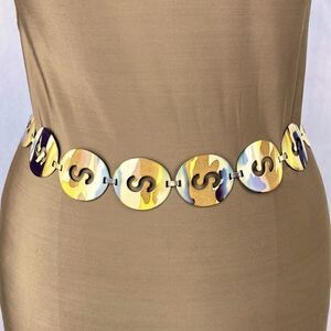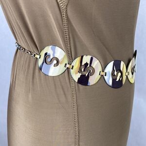 Womens metal medallion belt with “S” cutouts in Camo or watercolor type color. Chain and lobster claw closure for adjustable fit. Great condition. Ships fast from a smoke free home.