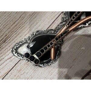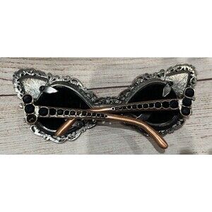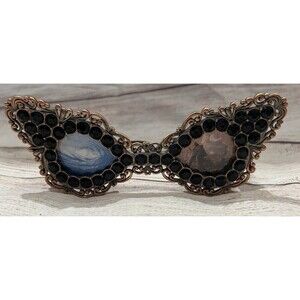 This antique double picture frame features a metal construction adorned with rhinestones, giving it a touch of elegance and luxury. The frame is designed to hold two photos securely with its double frame style, perfect for showcasing cherished memories or artwork in a stylish and vintage-inspired display. The compact size makes it suitable for smaller spaces or as a unique addition to a larger collection of frames, adding a touch of sophistication to any home décor. There is one large rhinestone missing on the side - see pictures. Approx size is 8x2. Smoke free home.