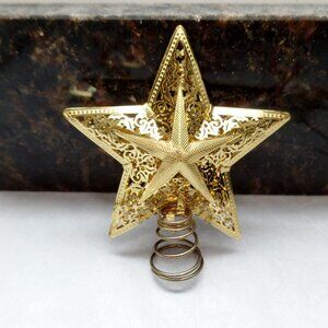 Great lot of 12 star shaped metal santas, small and medium ones have a small chain,large ones a string,also included is a small gold star shaped mini tree topper,Price is for all 13 pieces