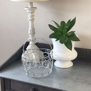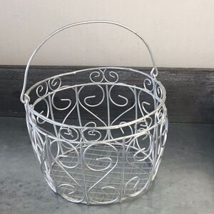 Silver color metal basket with wire handle. Scrolls all over and a mesh base. Great preowned condition.