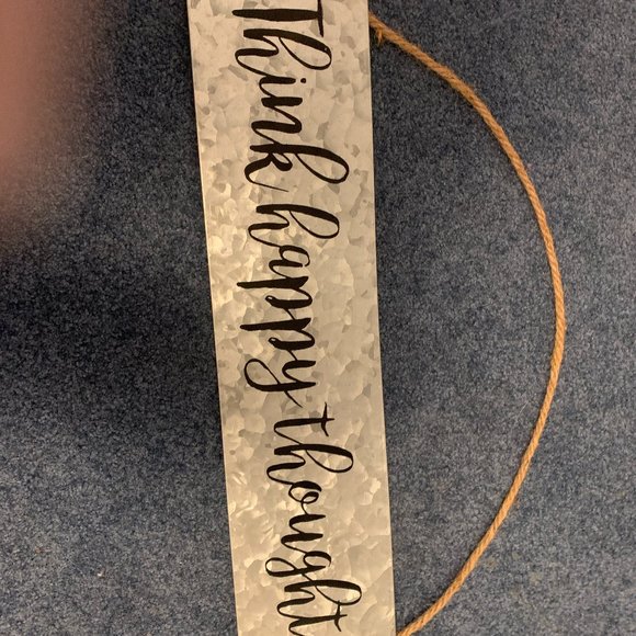 Nice metal sign. Says "think happy thoughts". Sisel like rope for hanging. About 18" in length
