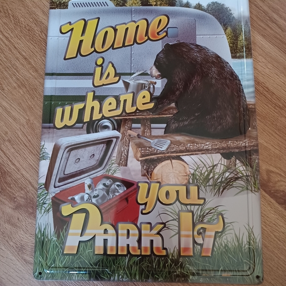 metal sign "home is where you park it" brand new without tags. hole in each corner for easy hanging