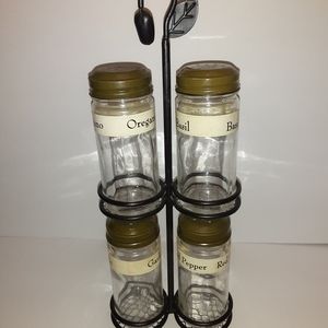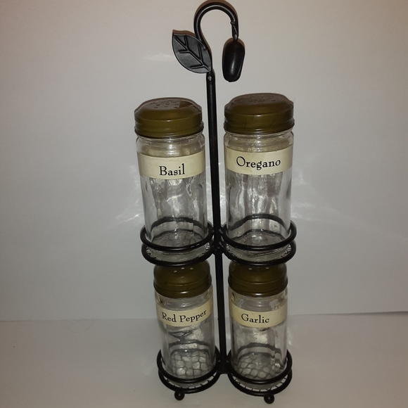 Metal Spice Rack 4 Glass Spice Jars Metal Leaf Display Stand. Condition is "Used".