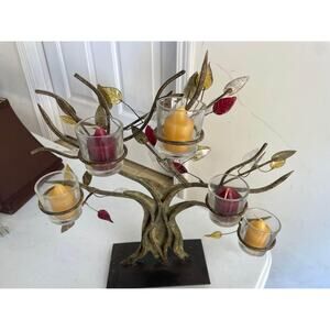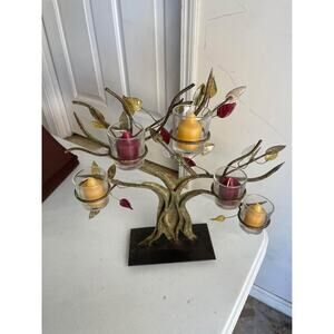 This sale is for a metal tree with glass votive holders. The tree is 16” wide and 16” tall. Comes with unused candles.