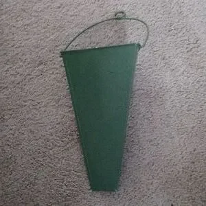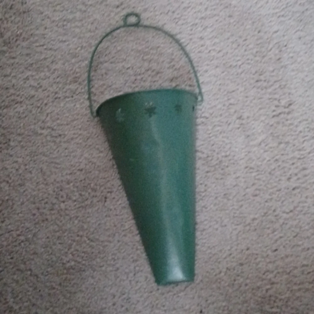Sage green metal, half moon top and narrow on bottom (vase shape) with handle measures L 8"