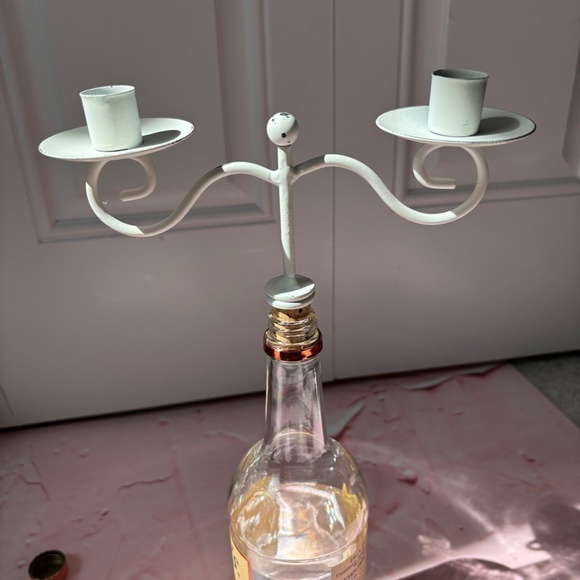 Metal bottle stopper candle holder. Off white colored painted metal that holds two candles and can fit into a bottle top.