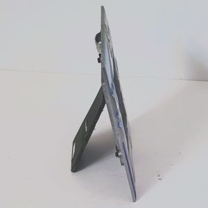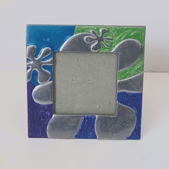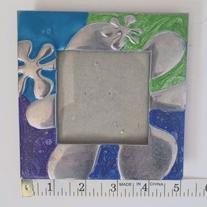 Metal and mixed color square frame, 3 sq inch picture. Stand or hang from added fastener. Gently used, excellent condition.