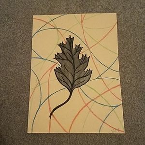 Graphite, Charcoal and Colored Pencil drawing of a Metallic colored leaf with a swirl of colors in the background.