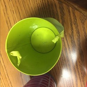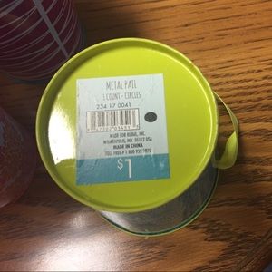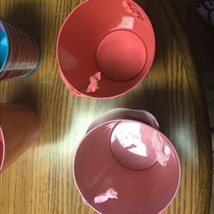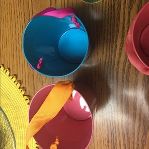 23 pails with different designs. Orange 15, 4 purple, 2 turquoise, 1 pink flower, 1 pink polka dot. Some show some wear inside or in the shape as they were used for a first grade project. Would be cute as shower favors, pencil holders, etc.