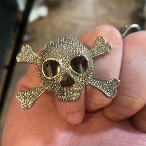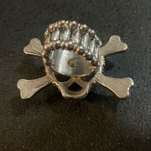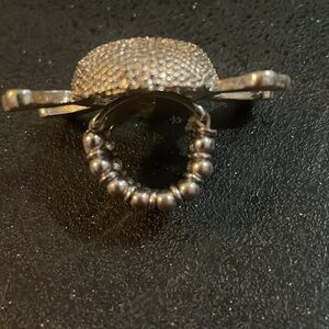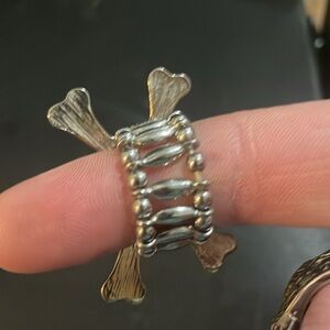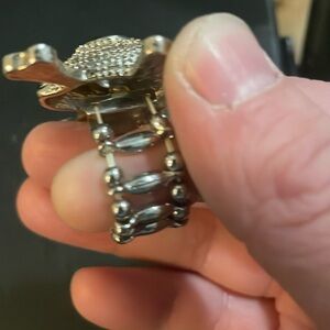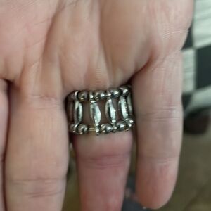 Metal ring with 2 elastics strings running g through metal pieces Strech to fit finger fits my wife’s finger without stretching out