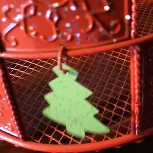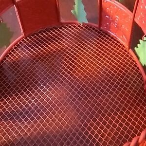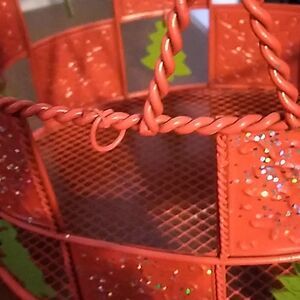 . The basket is approximately 11inches talk, approximately 9inches wide and approximately 4inches dee. It is a red metal Basket with a mesh bottom. It has an alternating patter of red glittery squares and cutout square with dangling gree glittery trees. Two of the trees (one on each side is missing on opposite sides at the top. ( pictured.)The handle is a twist design. The hooks are still on the basket so you could hang two charms like bells or stars or any other item of your choice.