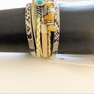 Metal Leaf Layered Animal Print Magnetic Bracelet - multi strand bracelet made from solid, animal print and embellished flat leather cord adorned with beads, natural stones and a metal leaf ornament. Approximately 7 3/4 inches. Lead compliant.
