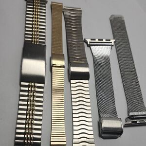 Set of metal watch bands featuring silver and gold tones. Perfect for adding a sleek touch to your watch.