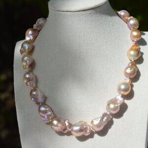 Make a bold statement with this stunning AAAA quality Flameball Baroque Pearl Necklace, hand-knotted and finished with a sleek sterling silver clasp. Measuring 17 inches, this necklace features rare metallic flameball baroque pearls with captivating overtones of pink, gold, and lavender—each pearl a one-of-a-kind natural masterpiece.