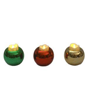 Add a festive touch to your holiday décor with this vintage set of 3 metallic ball candle holders, designed to resemble Christmas tree ornaments. The set includes one each in red, green, and gold, each holding a flameless candle for safe, glowing ambiance.