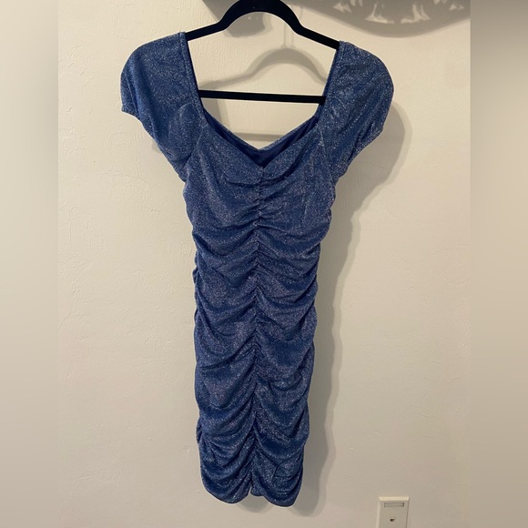 Shine with this stunning blue mini dress. Features a ruched design and shimmering fabric. Ideal for a night out.