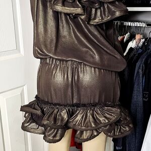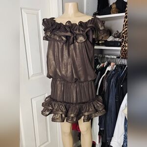 Elegant bronze chiffon metallic mini dress with ruffle details. Perfect for special occasions.
