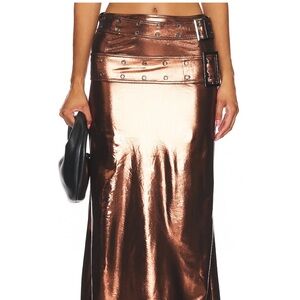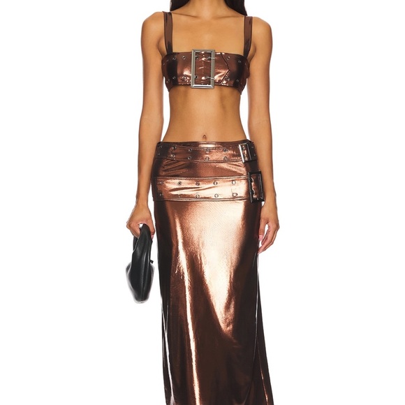 Stylish metallic bronze two-piece set with buckle details. Perfect for a bold look. Worn once, top size S and skirt size 2. I did cut the belt loops off the skirt as I preferred it without but can easily still wear the belts with it.