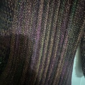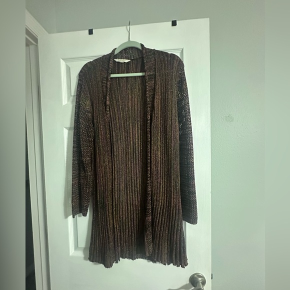 Open-front ribbed cardigan in a shimmering brown knit. Lightweight drape for easy layering and all-day comfort. Long sleeves and subtle metallic threads add a refined touch to casual or dress looks.