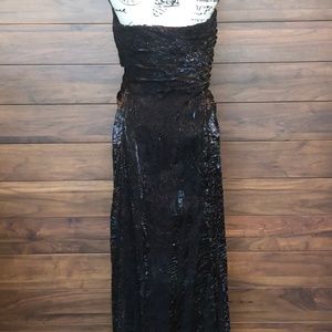 Carmen Marc Valvo strapless gown featuring pleating, bodice boning, and an invisible side zipper and hook and eyes.