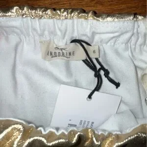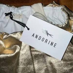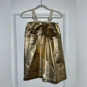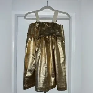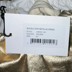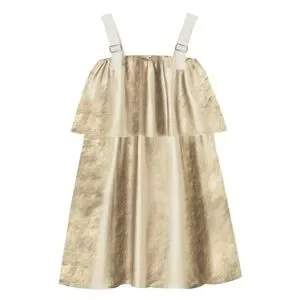 ANDORINE shiny gold metallic dress. Material is a thick shimmery metallic fabric. Shoulder straps with buckle details. A-line silhouette. Eye-catching shimmer dress for special occasions.