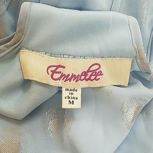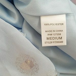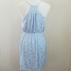 ●Light blue dress with silver metallic circles, spaghetti straps, racerback design, elastic waistband, ruffled front. Fully lined.