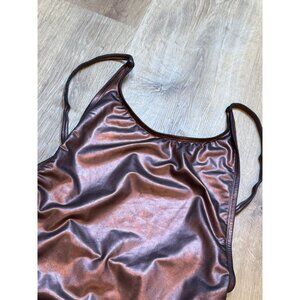 Shimmering swimsuit with a sleek copper finish, designed for comfort and style. Adjustable straps and stretchy fabric ensure a flattering fit.