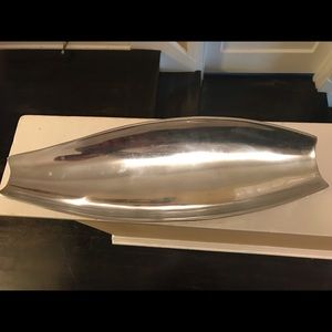 Metallic decorative container perfect for holding fruit on your counter; objets d’arte, or your tchotchkes. Underside has felt backing to prevent scratches. Measures approximately 19” long x 2” high x 4-6” wide.