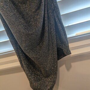 New, never worn Wraps around body and stretchy Size Small Black dress with silver shiny threads No glitter Forever 21