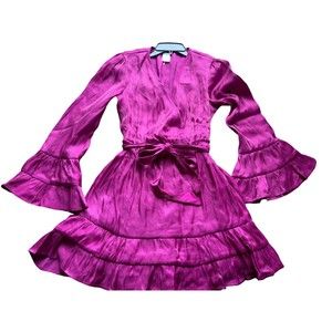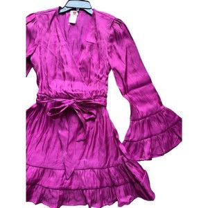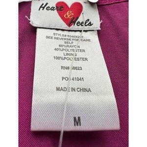 This metallic fuchsia dress from Heart & Heels is perfect for any occasion. The tiered, pleated A-line skirt gives it a playful and elegant look, while the V-neckline and flared sleeves add a touch of sophistication. The dress is made of lightweight satin fabric with a beautiful sheen and includes a matching belt for a cinched waistline.