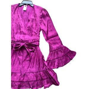 Metallic Fuchsia Tiered Satin Pleated Belted A Line V Neck Womens Medium Dress